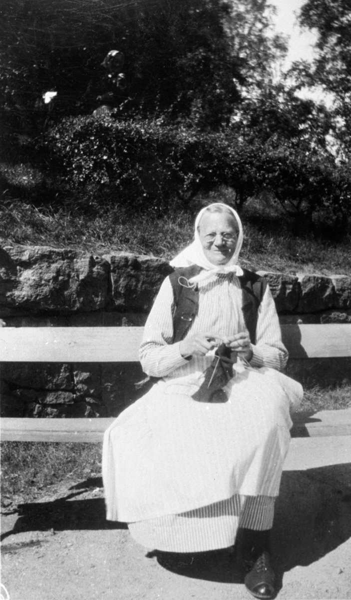 Äldre kvinna som sitter på en bänk vid Kärra Hökegård, ett försörjningshem för såväl senildementa som psykiskt sjuka, utvecklingsstörda och ensamstående mödrar. Verksamheten försvann i och med att Lackarebäckshemmet stod klart 1951.