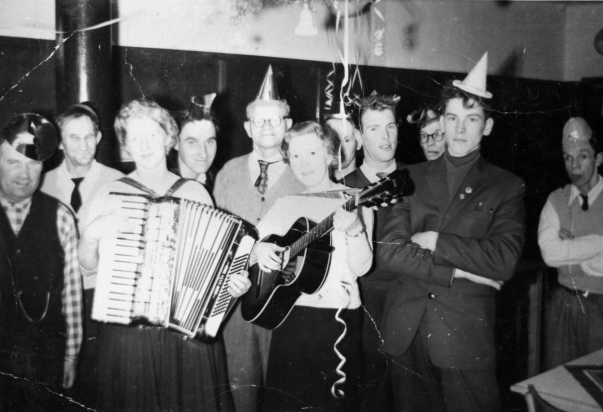 I förgrunden kvinnor med dragspel och gitarr. Med på bild fr.v. Åke Magnusson.