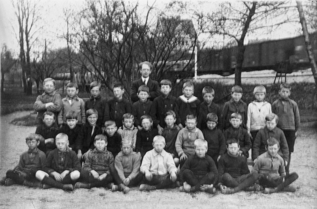 Villard Nilsson Stockelid med elever från Grevedämmets skola. Pojkar sittande och stående, i bakgrunden syns järnvägen.