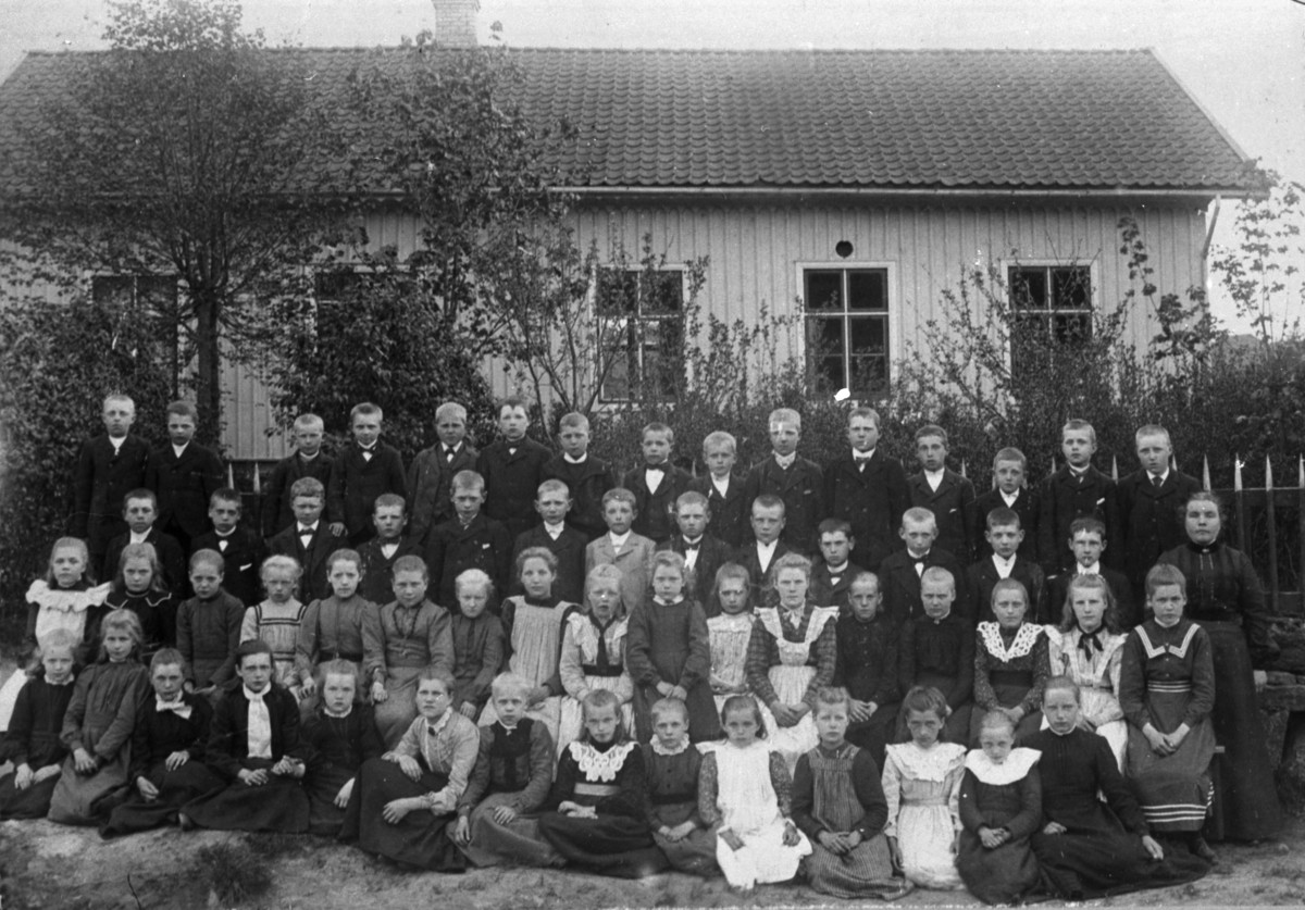 Flickor och pojkar sittandes och ståendes utanför skolbyggnaden. Julia Olsson med elever.