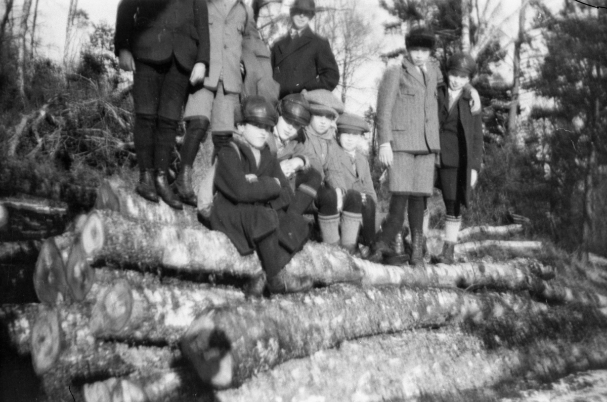 Pojkar från Grevedämmets skola, ståendes och sittandes på stockar. På söndagspromenad med magister Villard Nilsson Stockelid.