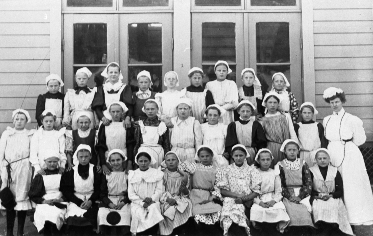 Flickor utanför Trädgårdsskolan, klädda i skolkökskläder.