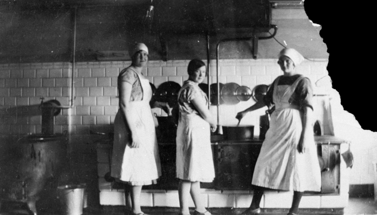 Köket efter det att kokspisen installerats på Kärra Hökegård. Till vänster en stor golvgryta som det eldades under för potatis och ärtor bl.a.