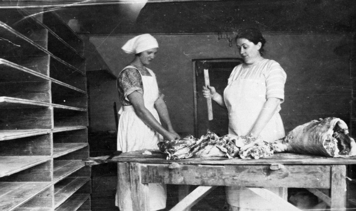 Styckning av en bagge i bagarstugan vid Kärra Hökegård. Hanna Larsson, föreståndarinnan, står till höger i bild.