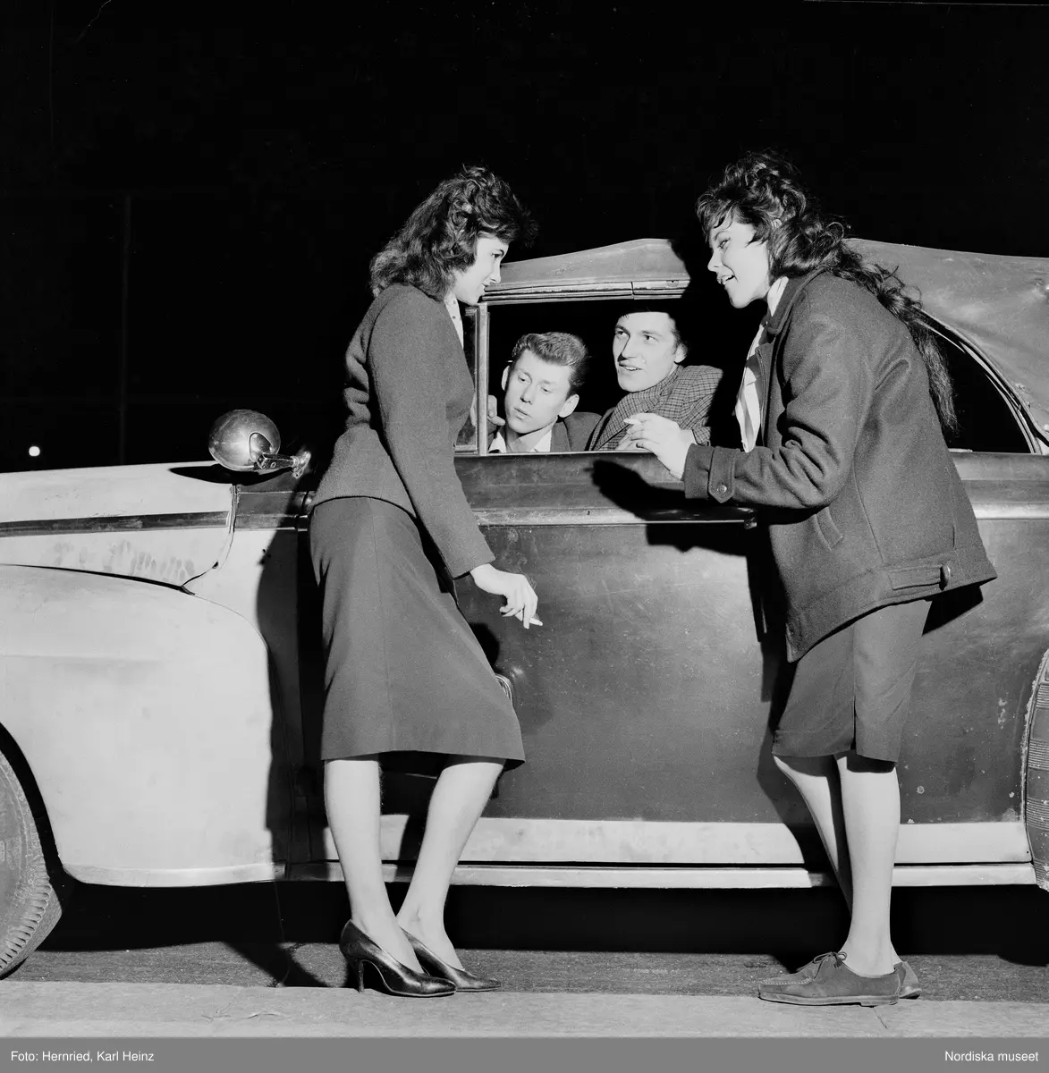 Gatumiljö med bilburen ungdom.Två unga kvinnor, den ena med cigarett i handen, hänger vid bil och samtalar med två unga män som tittar ut genom den nedvevade rutan.