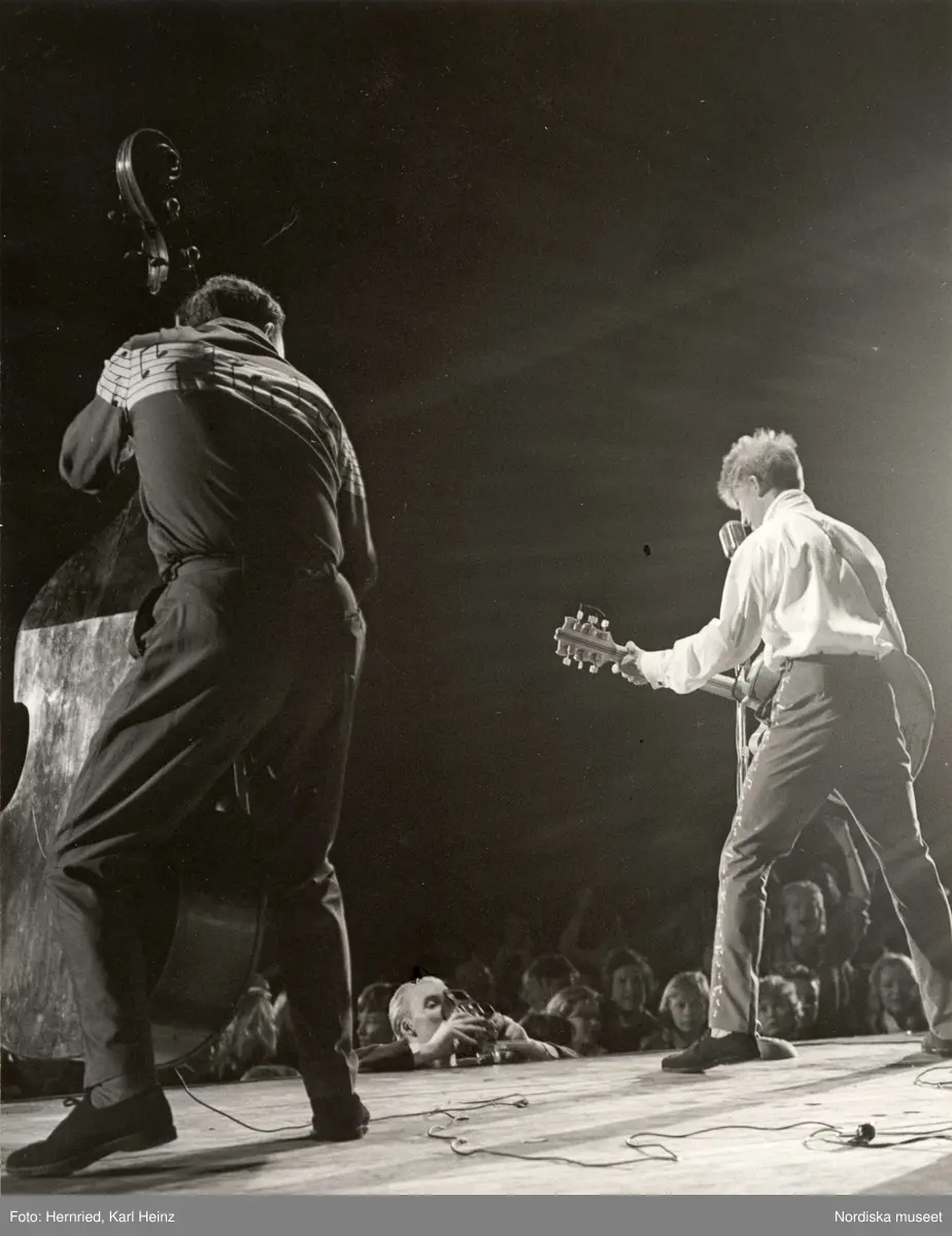 Popartisten Tommy Steele med gitarr på scen, tillsammmans med basist.