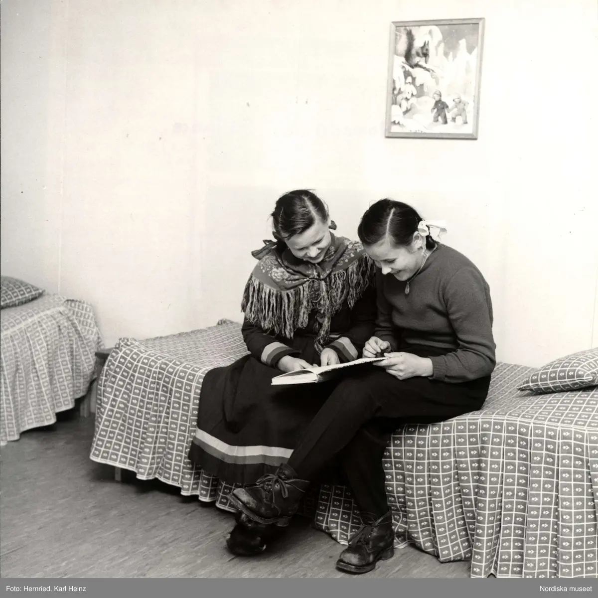 Nomadskolan i Gällivare, Lappland. Interiör från ett rum där två flickor sitter på sängkant och läser