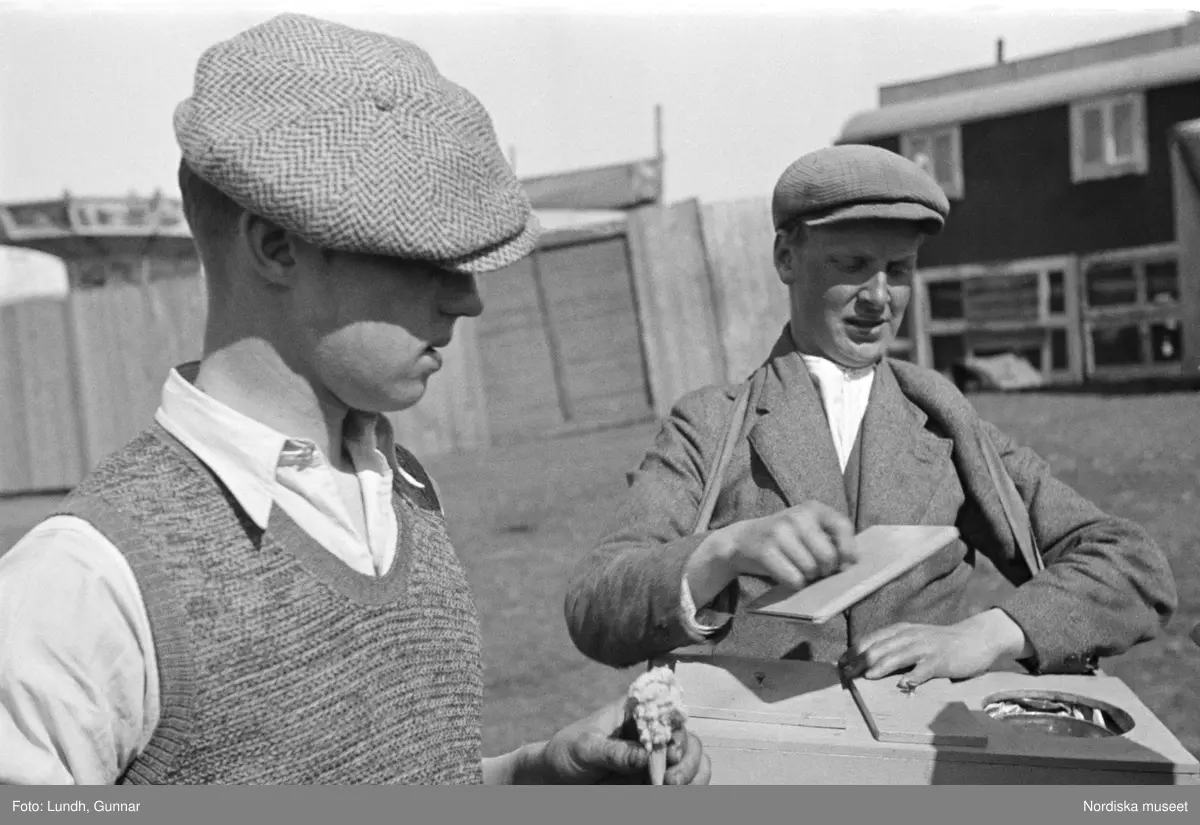 Ung man med kepsen på sned och annan man med låda på magen. Troligen glassförsäljning. Familjen Taikons läger i Johanneshov, södra Stockholm.