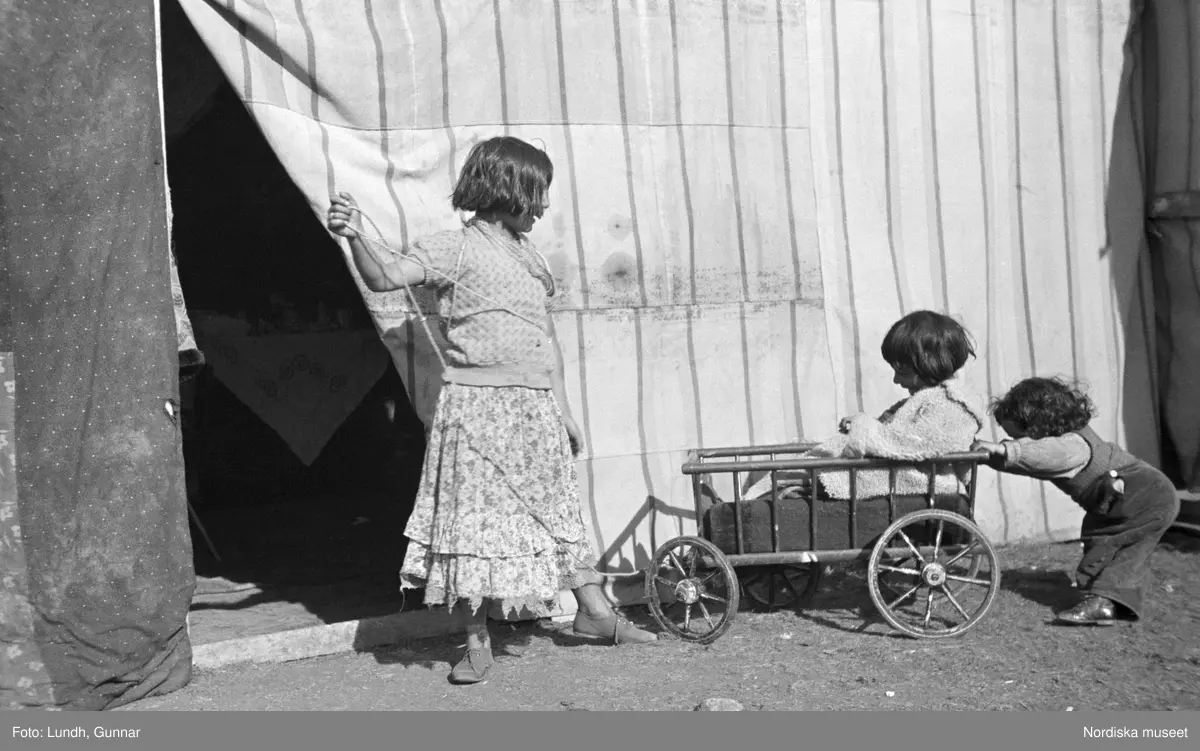 Tre barn leker med en vagn/skrinda. Familjen Taikons läger i Johanneshov, södra Stockholm.