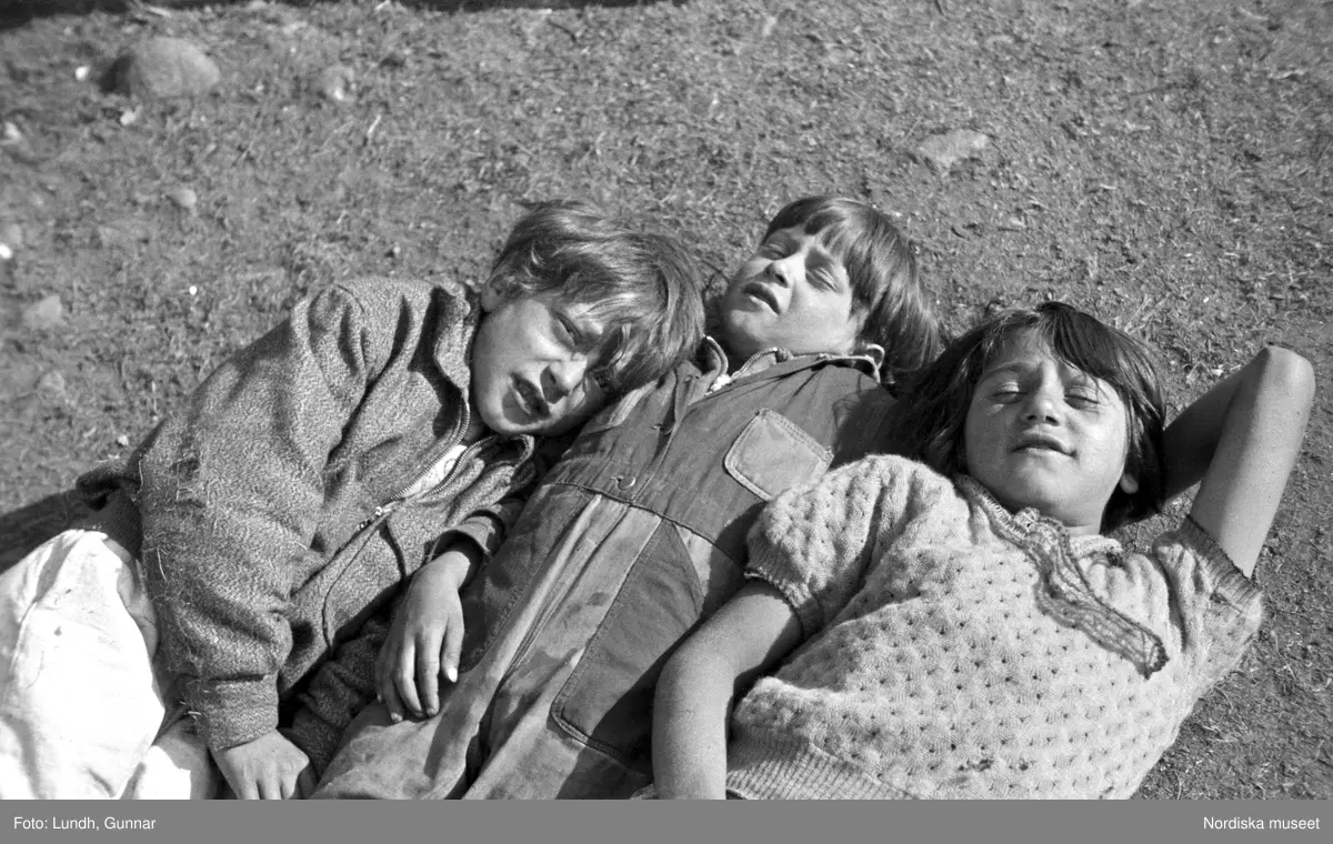 Tre barn ligger i gräset. Familjen Taikons läger i Johanneshov, södra Stockholm.