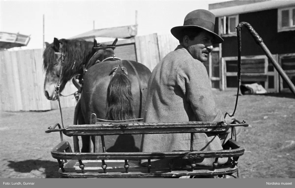Bild av man i vagn spänd bakom häst. Familjen Taikons läger vid Johanneshov, södra Stockholm