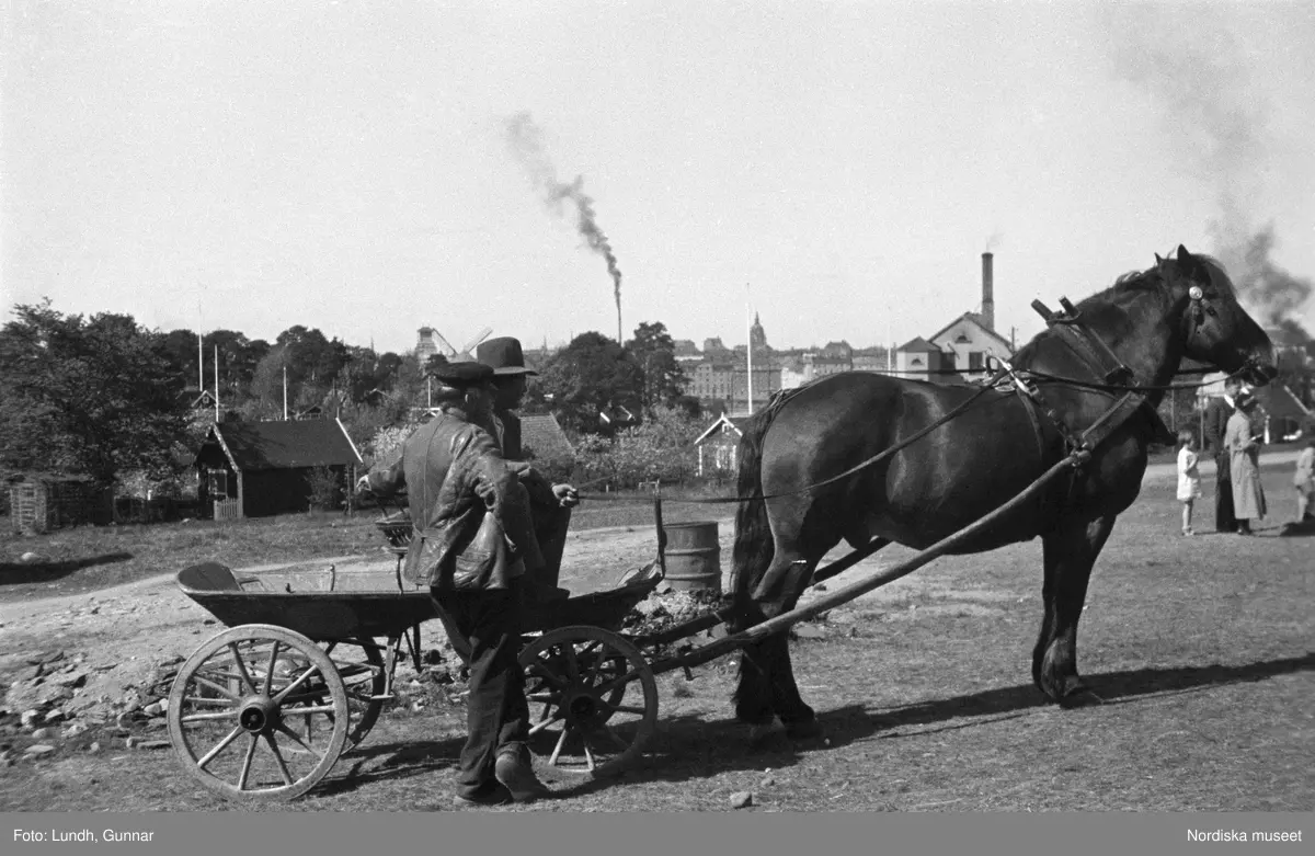 Bild av två samtalande män, den ene i vagn spänd bakom häst och den andre stående intill. Familjen Taikons läger vid Johanneshov, södra Stockholm