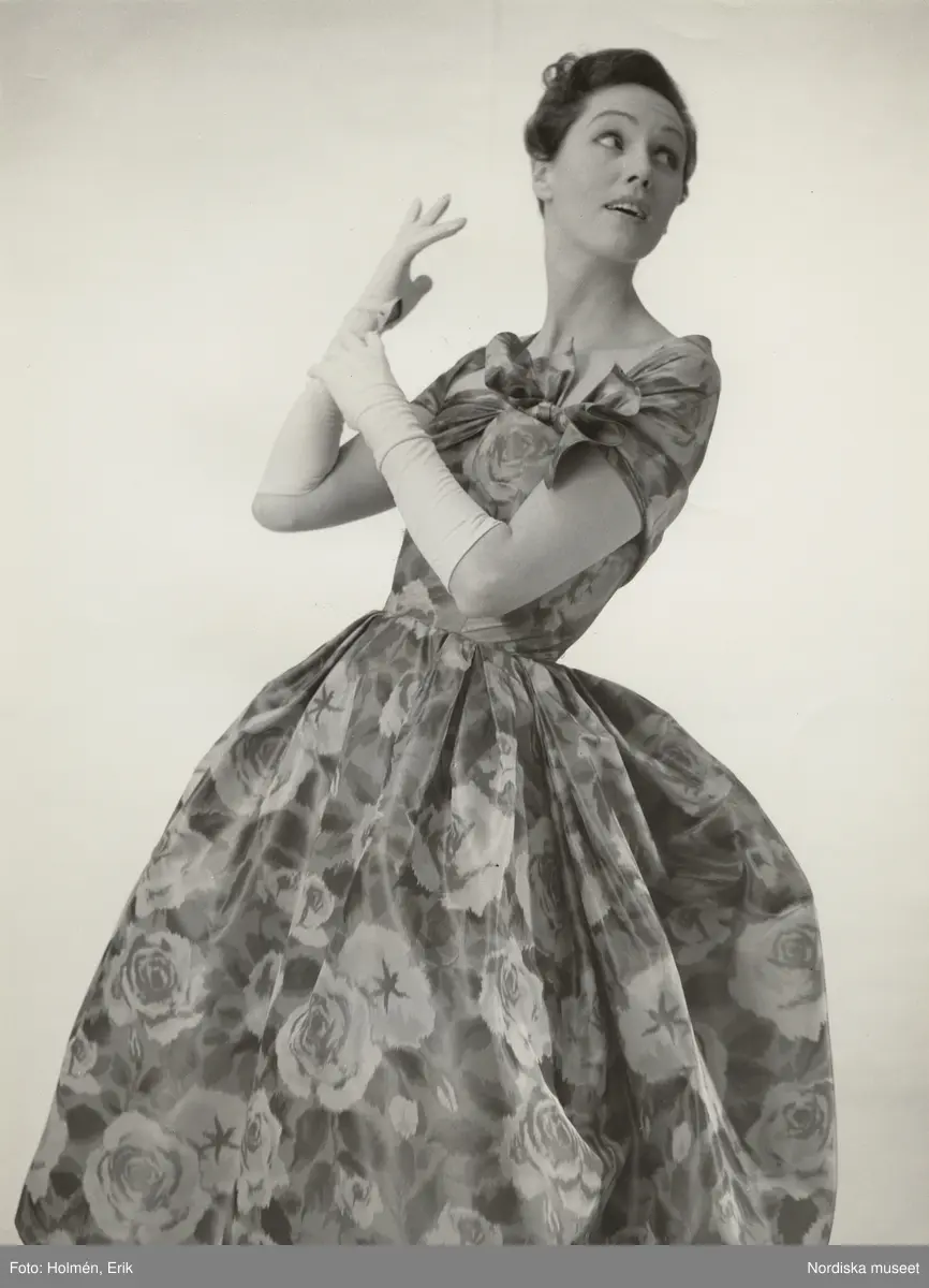 Modell i grönblommig taftklänning med rosett och vita handskar.