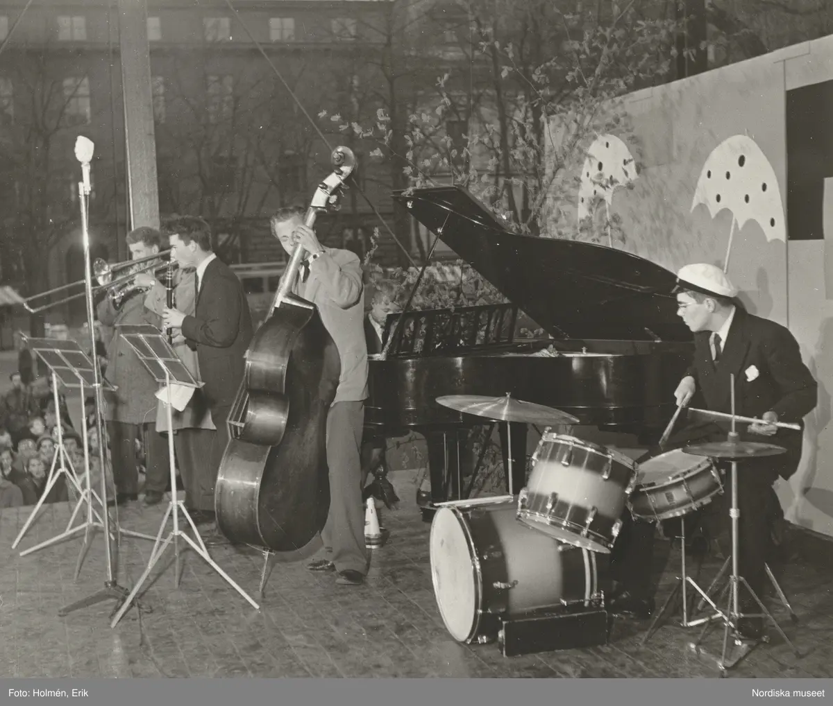 Tonårsmodevisning i Kungsträdgården i Stockholm, Nordiska Kompaniet. Orkester spelar musik.