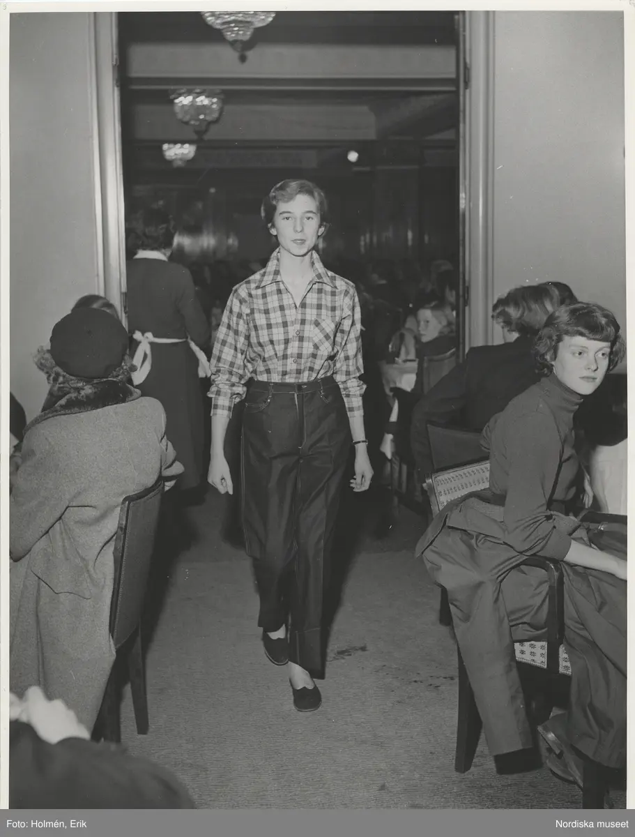 Tonårsmodevisning. Modell i skjorta och byxor, publik sitter vid bord.