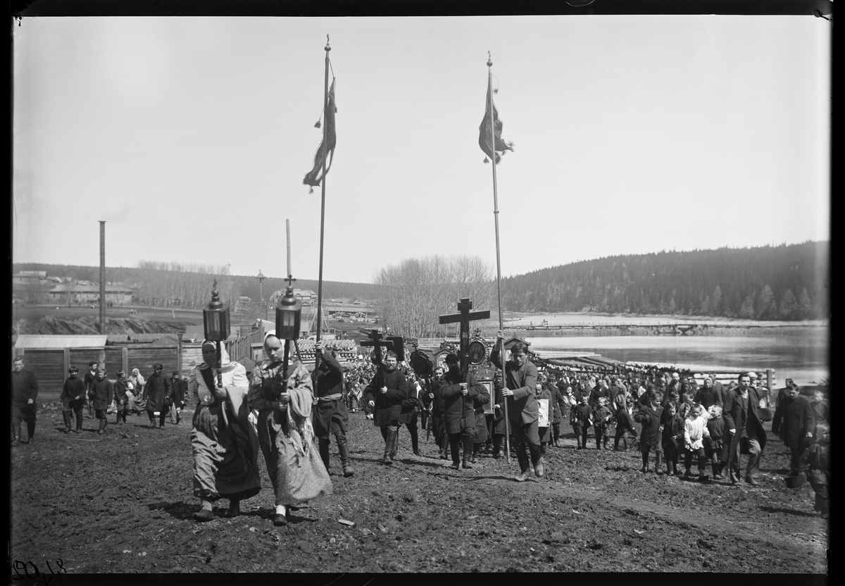 Namnsdagsprocession till kyrka. Människor med helgonbilder går till grannkyrkan. Nischnij-Tagil, Ural, Ryssland.