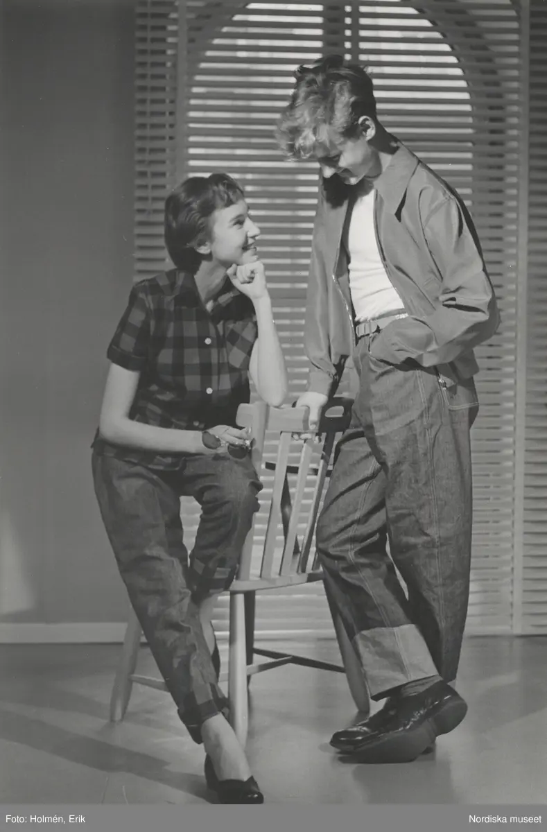 Tonårsmode. Flicka i rutig skjorta och jeans från Melka sitter på en stol. Pojke i poplinjacka, vit t-shirt och jeans står bredvid. Persienn i bakgrunden.