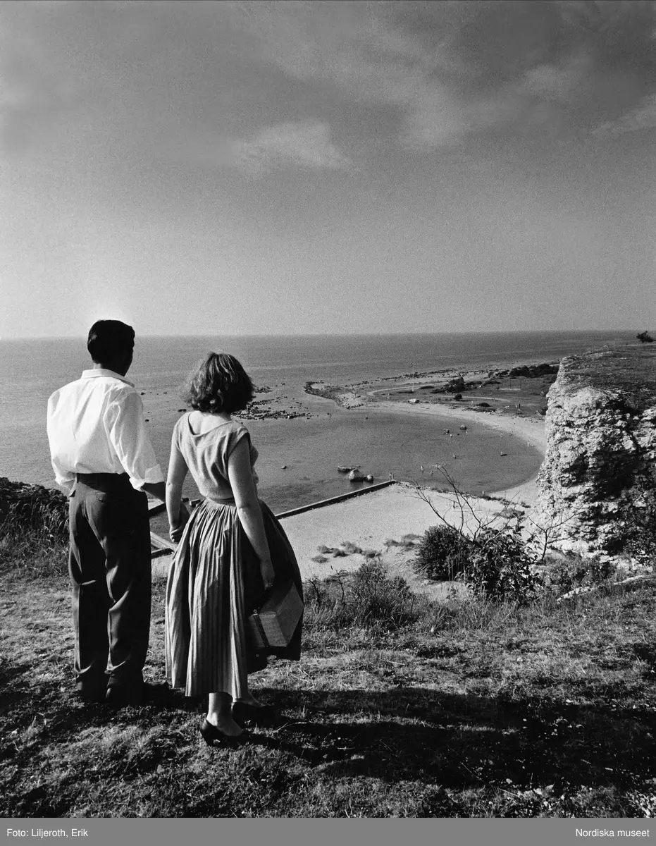 Man och kvinna tittar ut över badstranden vid Snäckgärdsbaden, Visby