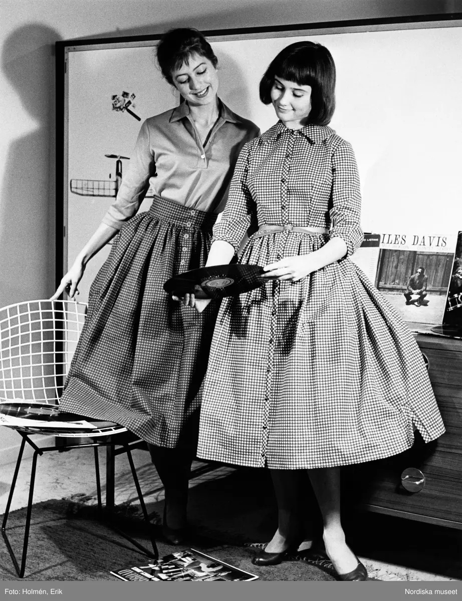 Två tonårsmodeller tittar på en LP-skiva. Modellen till höger är klädd i rutig klänning med skärp från Wahls i vinterbomull, 79 SEK, mörka pumps. Modellen till vänster är klädd i rutig kjol från Wahls i vinterbomull, 39 SEK, samt blus från Katja of Sweden, 3T- Jersey, 32 SEK, mörka pumps. Bakom modellerna syns ett Miles Davis-skivomslag på en byrå, samt en Wire-stol med skivor på. På golvet ligger en matta och ett skivomslag.