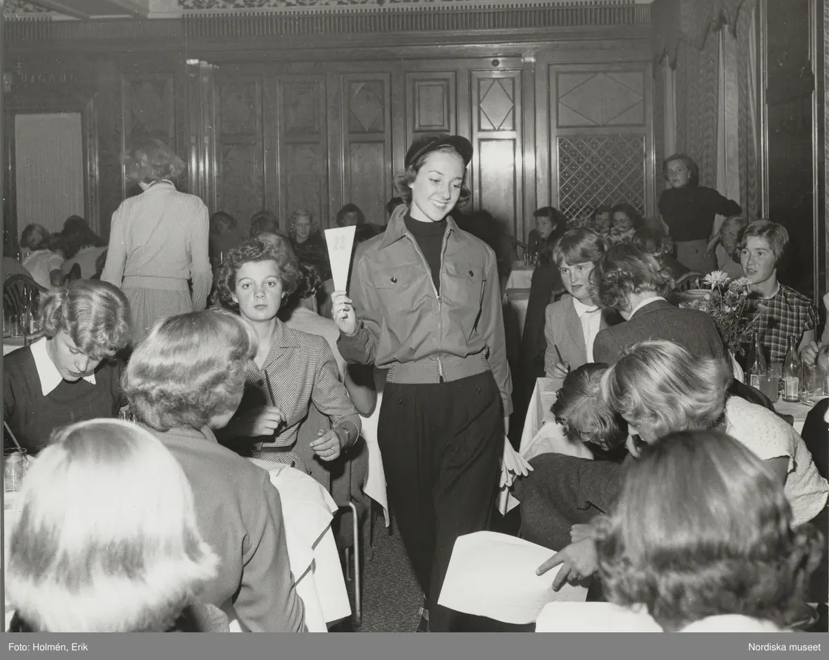 Nordiska Kompaniet. Tonårsmode 1950. Kvinna i kort ljus lumberjacka med dragkedja. svarta byxor och på fötterna sannolikt pjäxor. Runt henne en ung modepublik vid dukade bord med läskedrycksflaskor. Text på baksidan: "Tonårsmodet 1950. Första tonårsvisningen f. inbjudna hösten 1950"