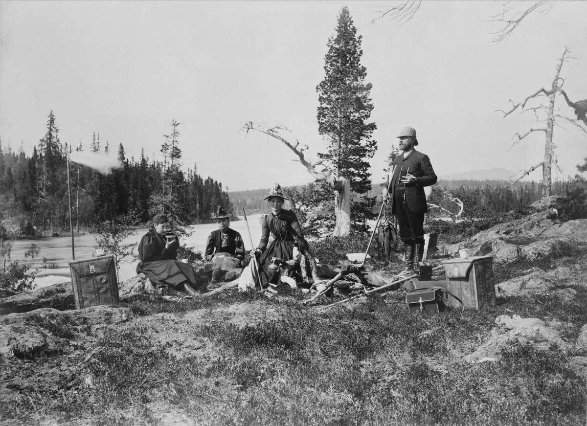 "Rast vid forshuvudet ovanför Bieliteforsen under en färd 1895 till vårhelgen i Fantomakke.Från vänster: Ada Danielsson, Berta Zetterberg, Erika Ingberg samt kyrkoherde Lars Dahlstedt, den sistnämnde skrudad i höga stövlar och tropikhjälm."
