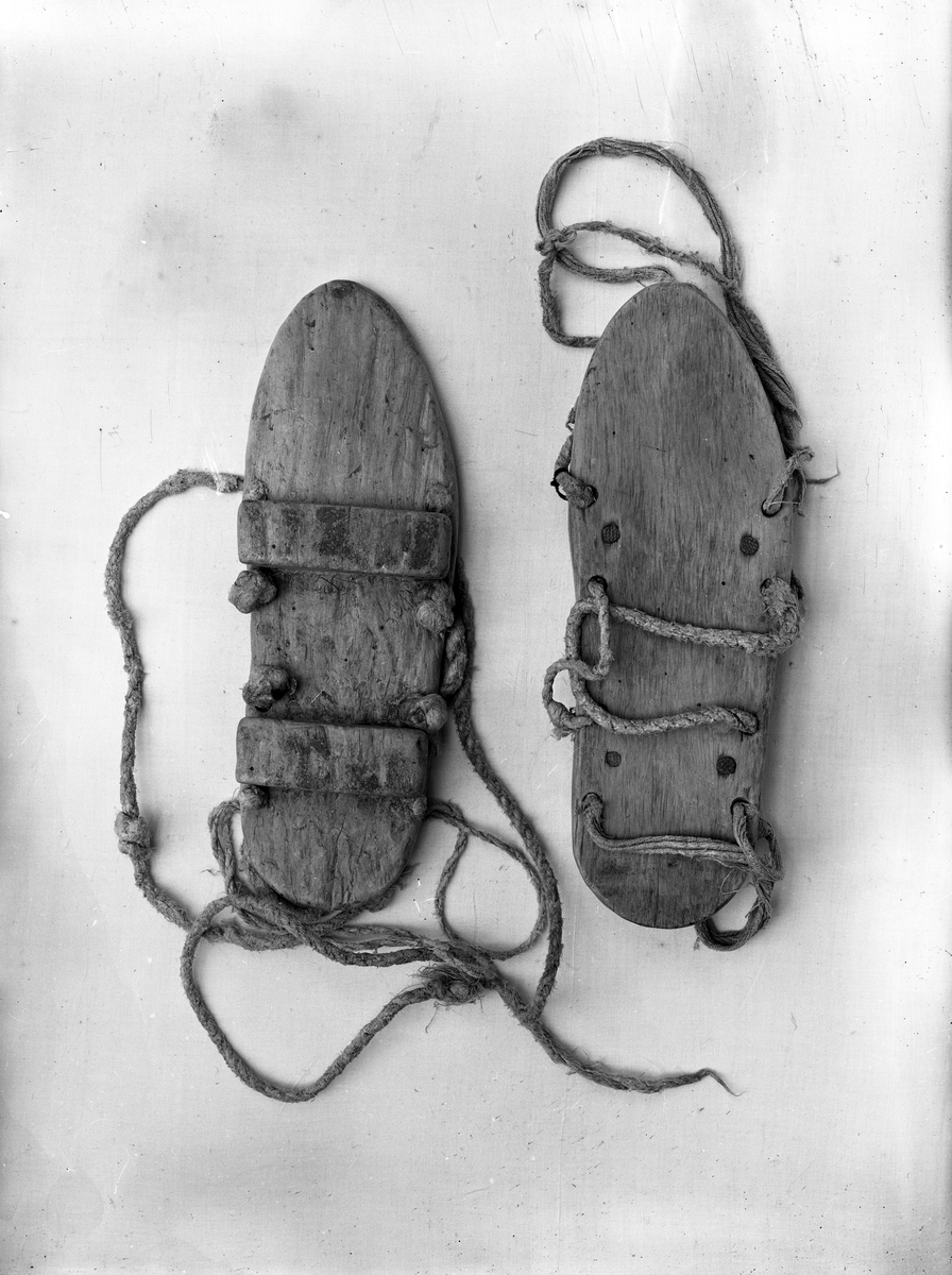 Träsandaler, "Klåmper", från Nuckö, Estland. Nordiska museets inv.nr NM.0145305