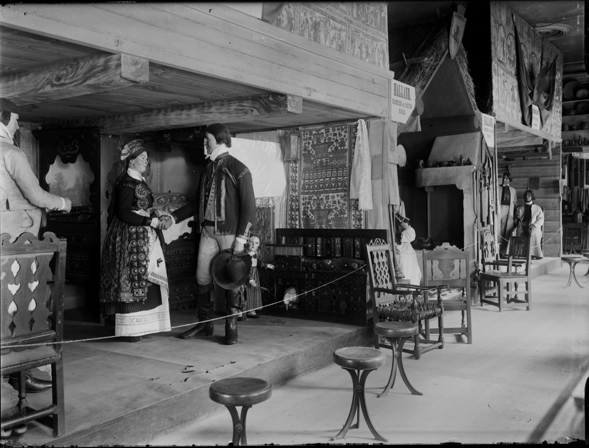 Interiör från Skandinavisk-etnografiska samlingarna. Tablåscen från södra paviljongen på Drottninggatan, Nordiska museet. Ingelstadsstugan från Skåne i förgrunden, därefter bondstuga från Åstorp i Halland.