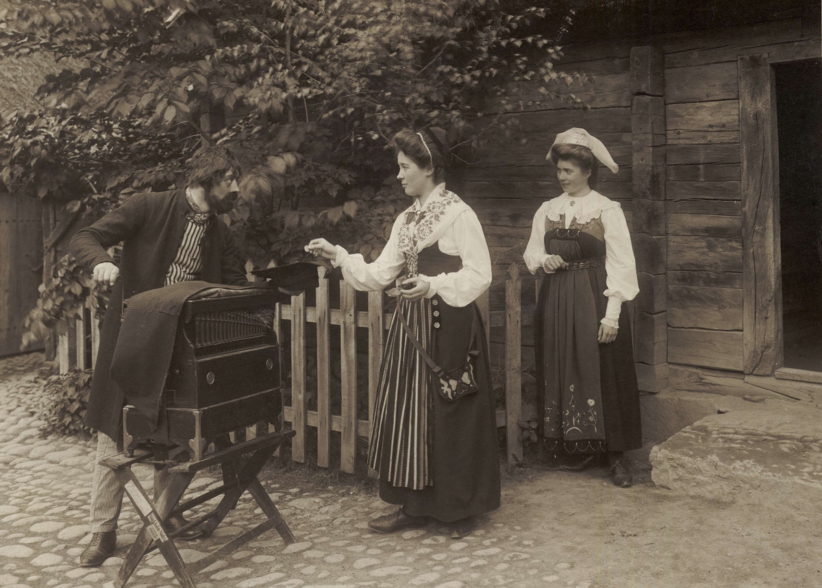 En positivhalare tar emot ett mynt av en folkdräktsklädd kvinna. Skansens vårfest 1905