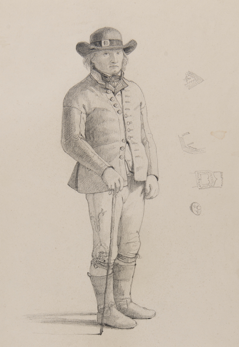 Tähr Håganson från Käfvlinge Harjagers härad i Skåne. Blyertsskiss av stående man i helfigur i dräkt. Blyertssteckning i storformat av O. Wallgren