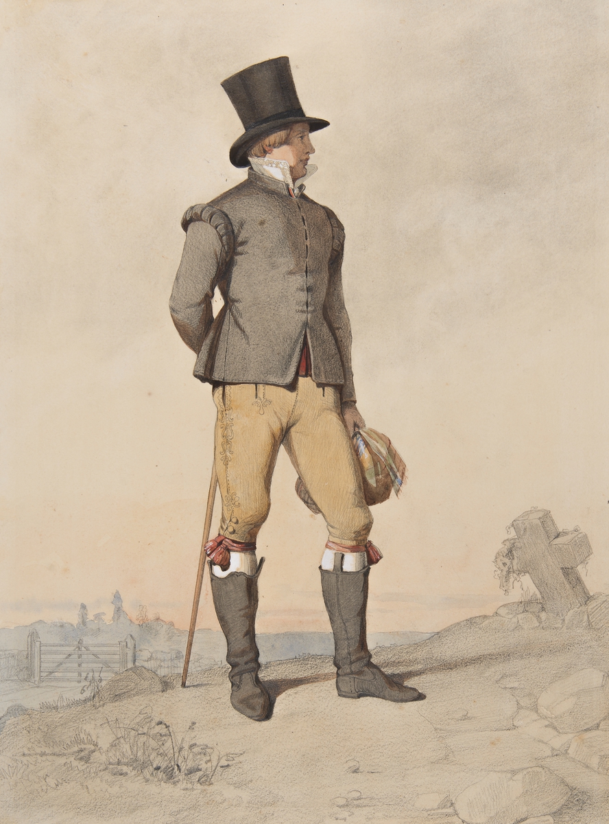 Dräkt. Man i dräkt i helfigur snett framifrån i landskap med stenkors och grind. Han bär en korg med duk över i handen. Akvarelerad blyertsskiss l i storformat av O. Wallgren