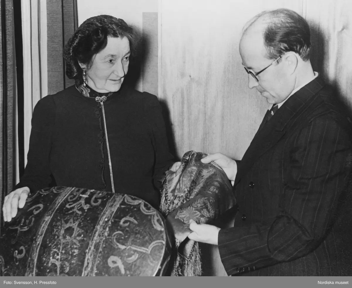 Professorskan Emelie Demant Hatt överlämnar en samling föremål som tillhört Johan Turi som gåva till Nordiska museet i samband med museets Lapplandsafton 4 december 1940.