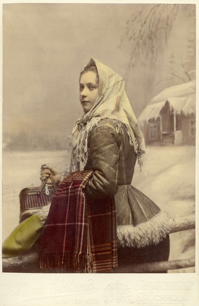 Ung flicka klädd i vinterdräkt från Mora, Dalarna.