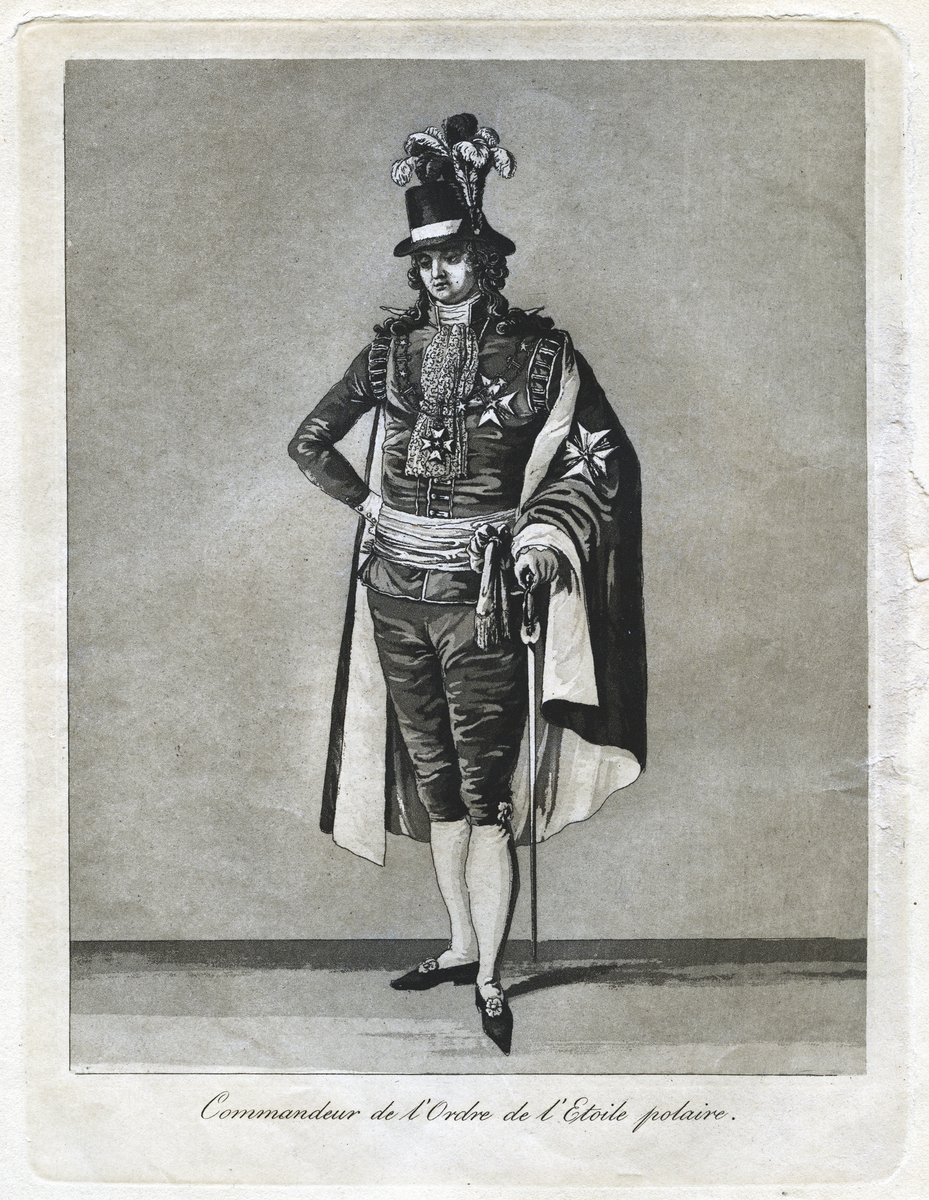"Commandeur de l'Ordre de l'Etoile polaire." Dräkt för kommendör av Nordstjärneorden. Akvatint trol. av J A Aleander, 1780-tal.