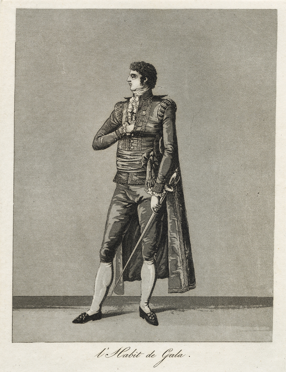 Gustaf III:s nationella dräkt/svenska dräkten. "L'Habit de Gala". Herre i galavariant av hovdräkten. Akvatint trol. av Johan Abraham Aleander, 1780-tal.