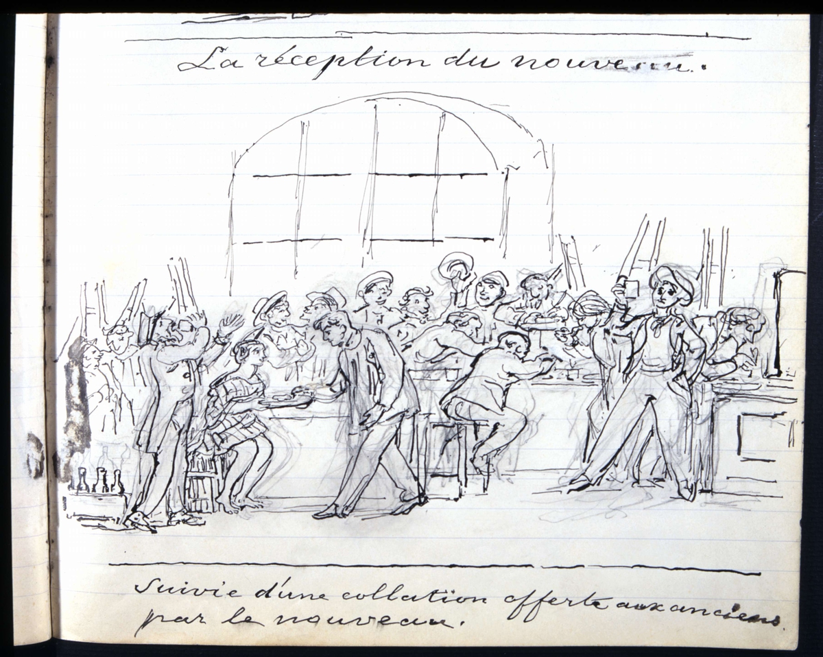 "La réception du nouveau. Suivie d'une collation offerté aux anciens par le nouveau." Studenter i Léon Cogniets konstskola, Paris. Tuschteckning av Fritz von Dardel, 1840.