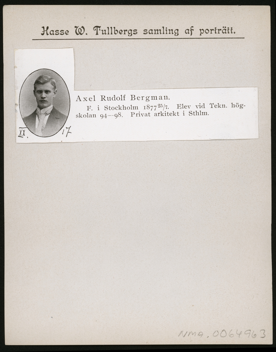 Porträttfotografi, bröstbild, föreställande ung man med kravatt. Axel Rudolf Bergman född i Stockholm 25 juli 1877, avliden 1965. Bergman studerade vid Tekniska skolan i Stockholm med fortsatta studier vid Kungliga Tekniska Högskolan 1894-1898. Som brukligt vid denna tiden läste han därefter vid Kungliga Akademien för de fria konsterna 1894-1898.