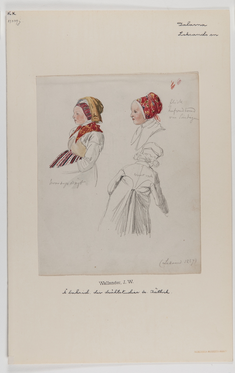 Delvis akvarellerad handteckning av J W Wallander. Kvinnodräkt från Leksand, Dalarna 1857. "Flick hufvudbonad om Söndagen" samt "hvardagsdrägt". Sekundär påskrift: " å baksidan div. dräktstudier fr. Rättvik". Nordiska museet inventarienummer57339j. På bilden finns tre människor avbildade. Kvinnan till vänster bär ”hvardagsdräkt”. På huvudet har hon rödhätta och gulluva eller yrvädershätta som den också kallas. Denna huvudbonad bars över hatt eller hätta som skydd mot kyla och väta. Vidare överdel, skinnliv, blommigt halskläde och rödrandig majd (förkläde). Kvinnan till höger bär ”flick huvudbonad om söndagen” dvs. roshätta. En huvudbonad för ogift kvinna av bomullstyg eller yllemuslin med tryckt mönster. Mannen i mitten bär ”svartrock” och hatt.