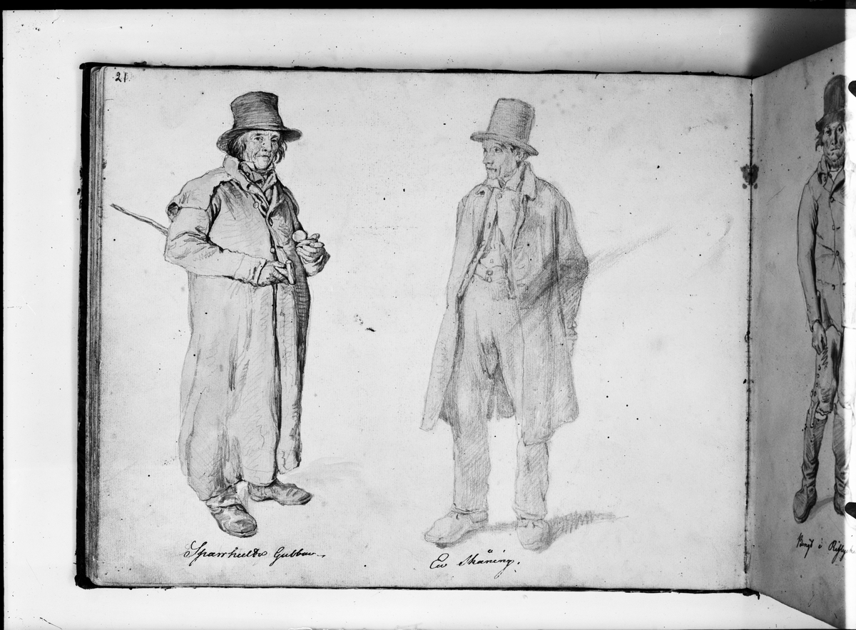 Foto av teckning i skissbok utförd av Kilian Zoll (1818-1860). Sparrhultsgubben från Sparrhult, Vislanda sn, Allbo hd i Småland. Till höger "En skåning". Båda männen iklädda rock, hatt och långa byxor.