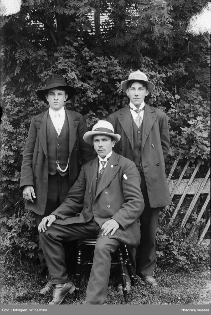 Tre unga män iklädda kostym och hatt. En sitter, två står i trädgård framför staket.