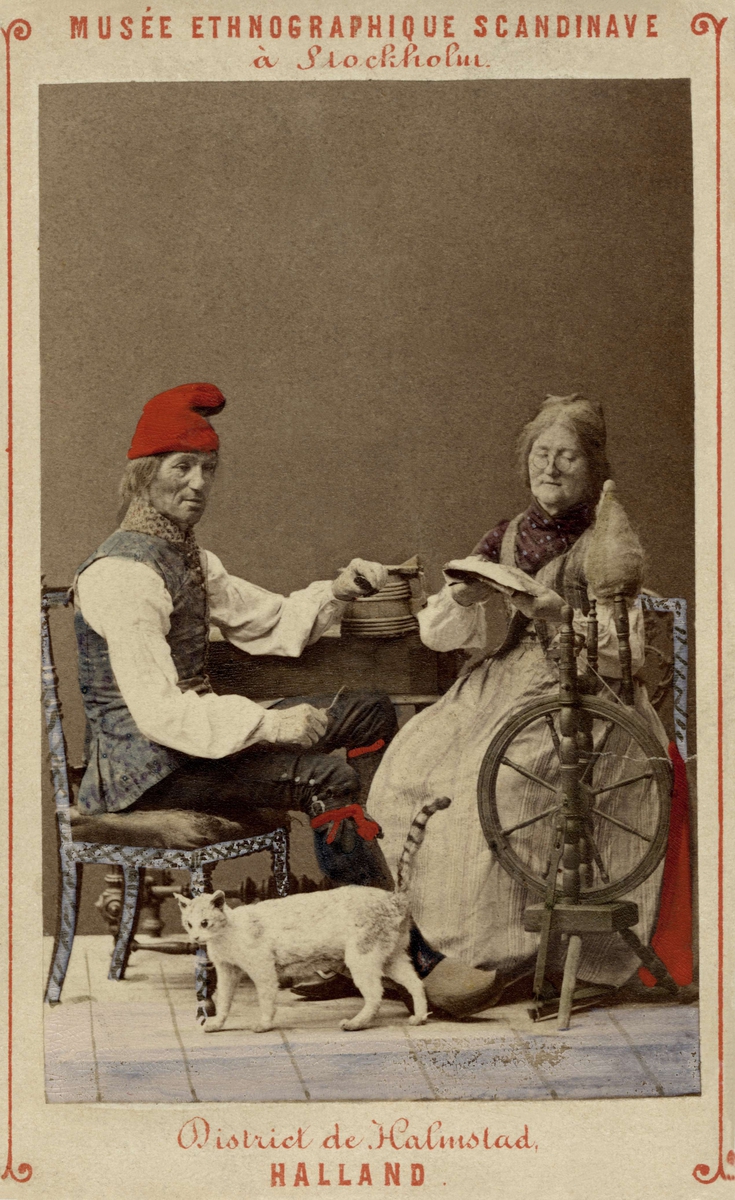 En man och kvinna i dräkter från Halmstad, Halland, sitter i ett kök, han snidar och hon spinner. Dräktdockor från Skandinavisk-Etnografiska samlingen i Stockholm. Handkolorerad.