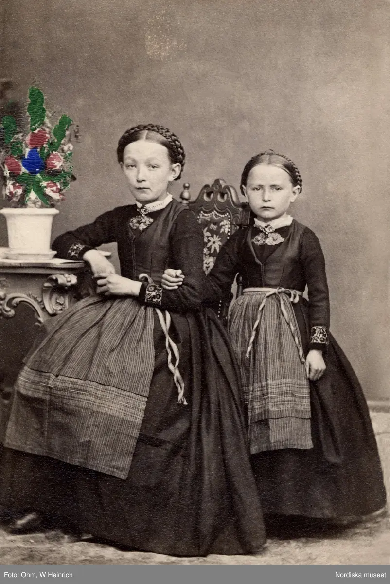 Porträtt av två flickor i klänningar och randiga förkläden; "Sören Svens töser i Mossheddinge Bara hd. Skåne." Den större flickan sitter, vilande armen på ett bord. Där står en krukväxt (kolorerad i efterhand).