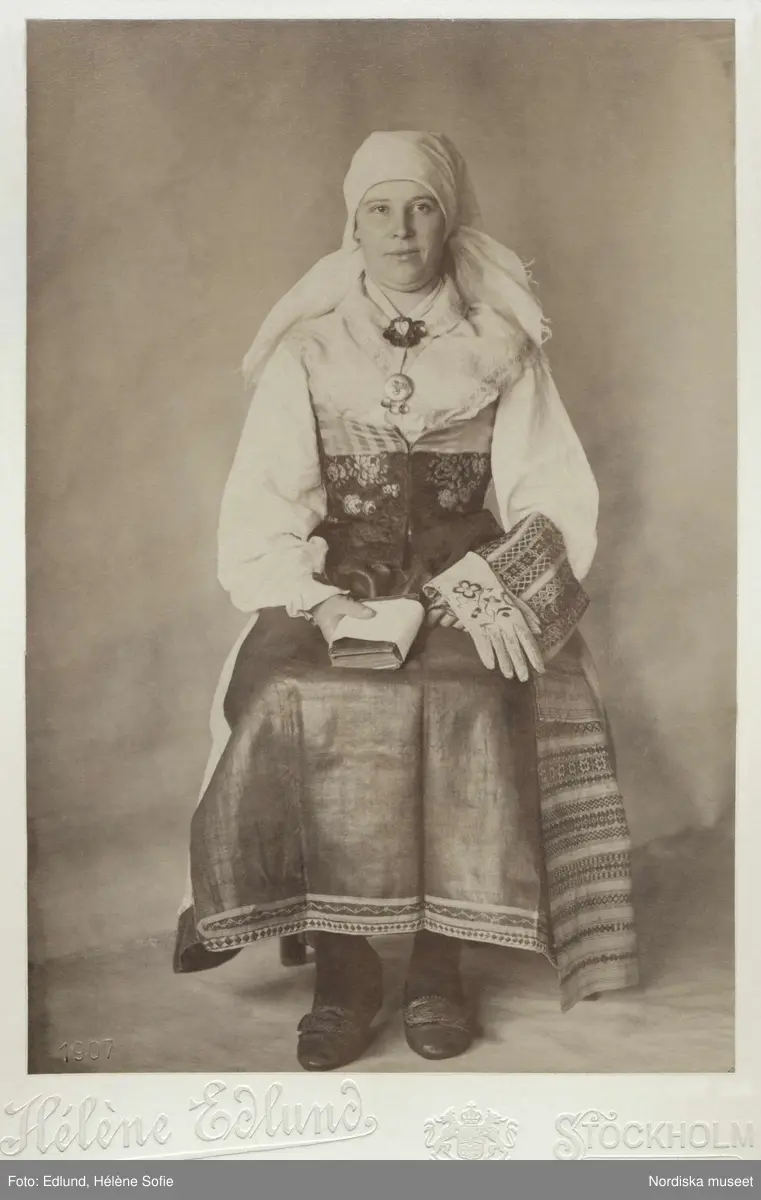 Kyrk och gillesdräkt från Norra Öland för gift kvinna. Porträtt av sittande kvinna med psalmbok och broderade handskar i knät.