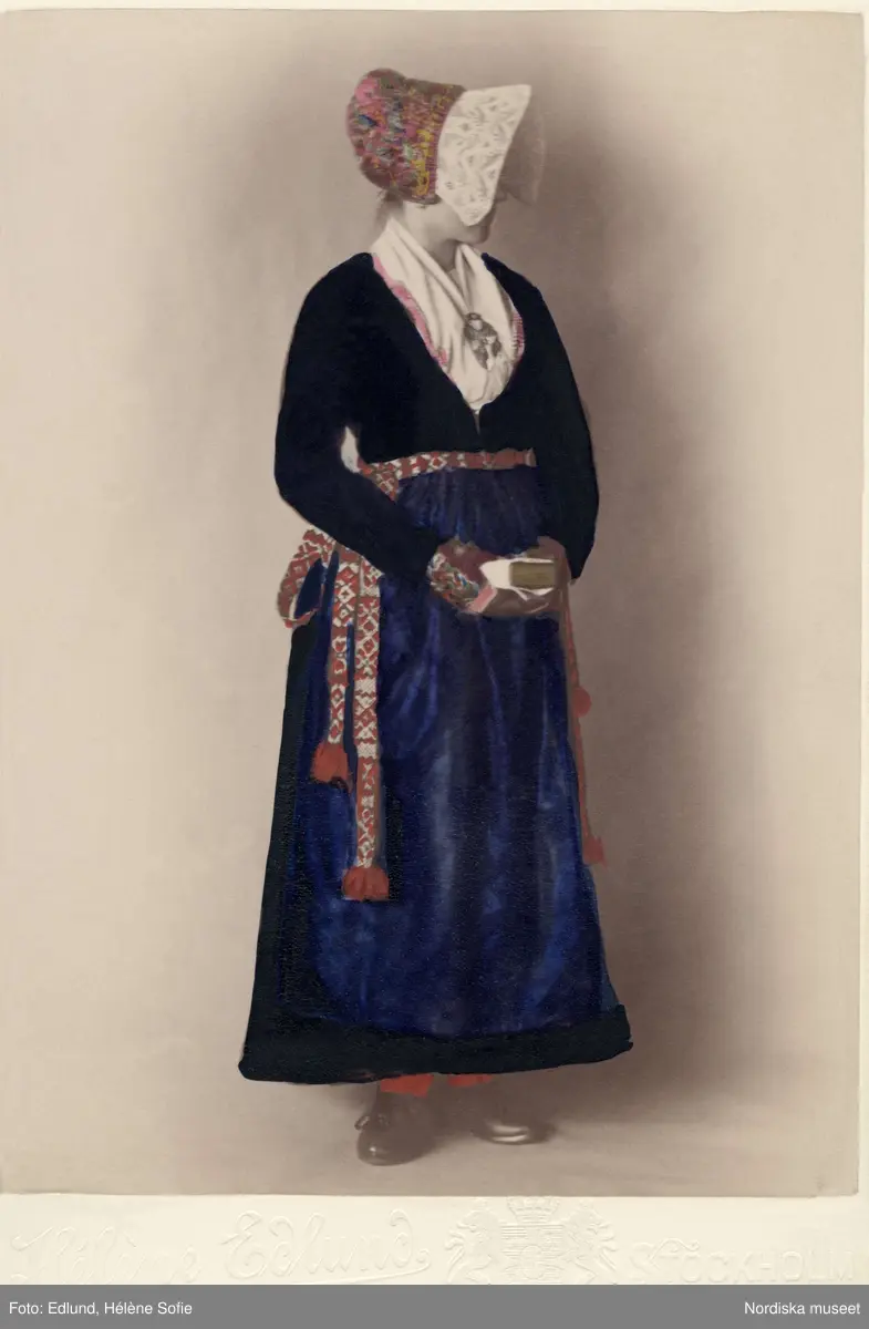Porträtt av kvinna i folkdräkt från dalarna, hon står med en bok i händerna, ansiktet bortvänt under hättan. Handkolorerat foto.