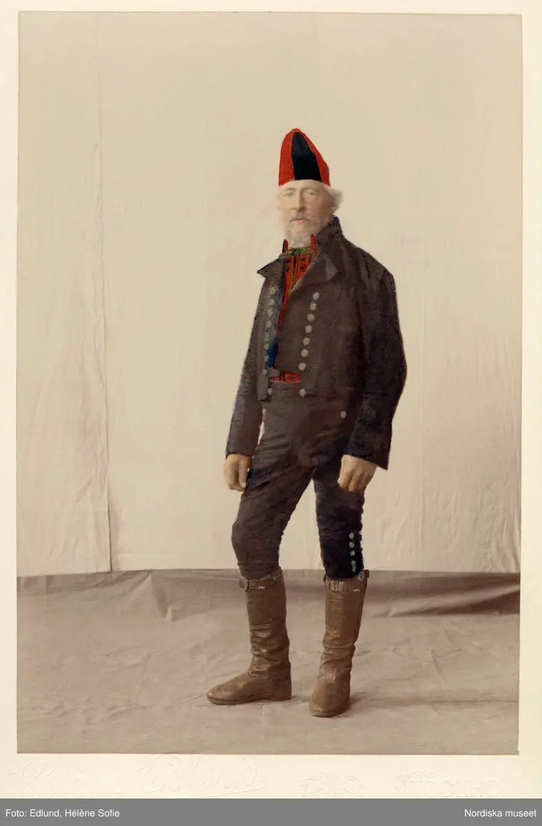 Man i helfigur klädd i festdräkt från Bjuråkers socken, Hälsingland. Handkolorerat fotografi