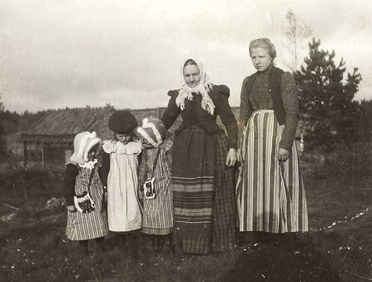 Två kvinnor och tre flickor klädda i förkläden. Sorunda sn., Södermanland