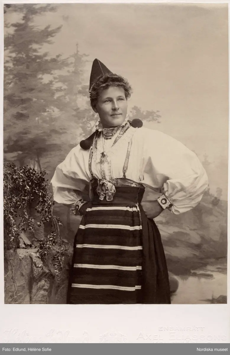 Kvinna poserar i en folkdräkt från Dalarna.