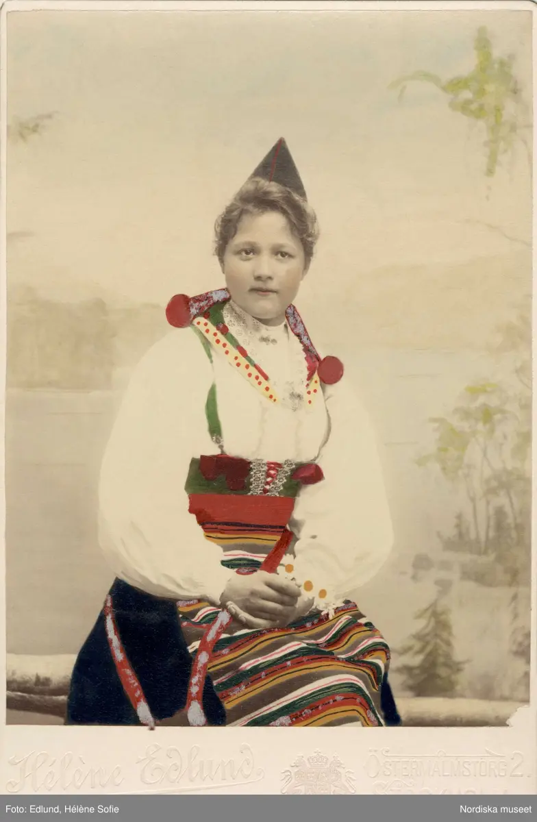 En kvinna klädd i folkdräkt från Dalarna sitter på en bänk, med en bukett prästkragar i handen. Handkolorerat fotografi.