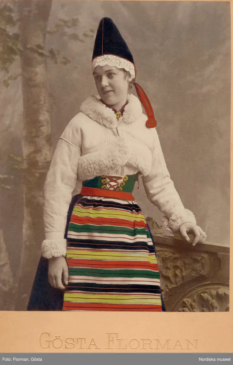 En kvinna poserar i en folkdräkt från Dalarna, med en kort vinterjacka till. Handkolorerat fotografi.
