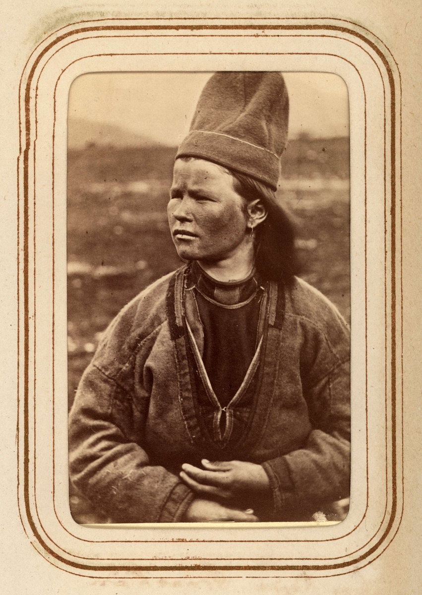 Profilporträtt av Inga Kajsa Granström, 22 år, Tuorpons sameby. Ur Lotten von Dübens fotoalbum med motiv från den etnologiska expedition till Lappland som leddes av hennes make Gustaf von Düben 1868.
