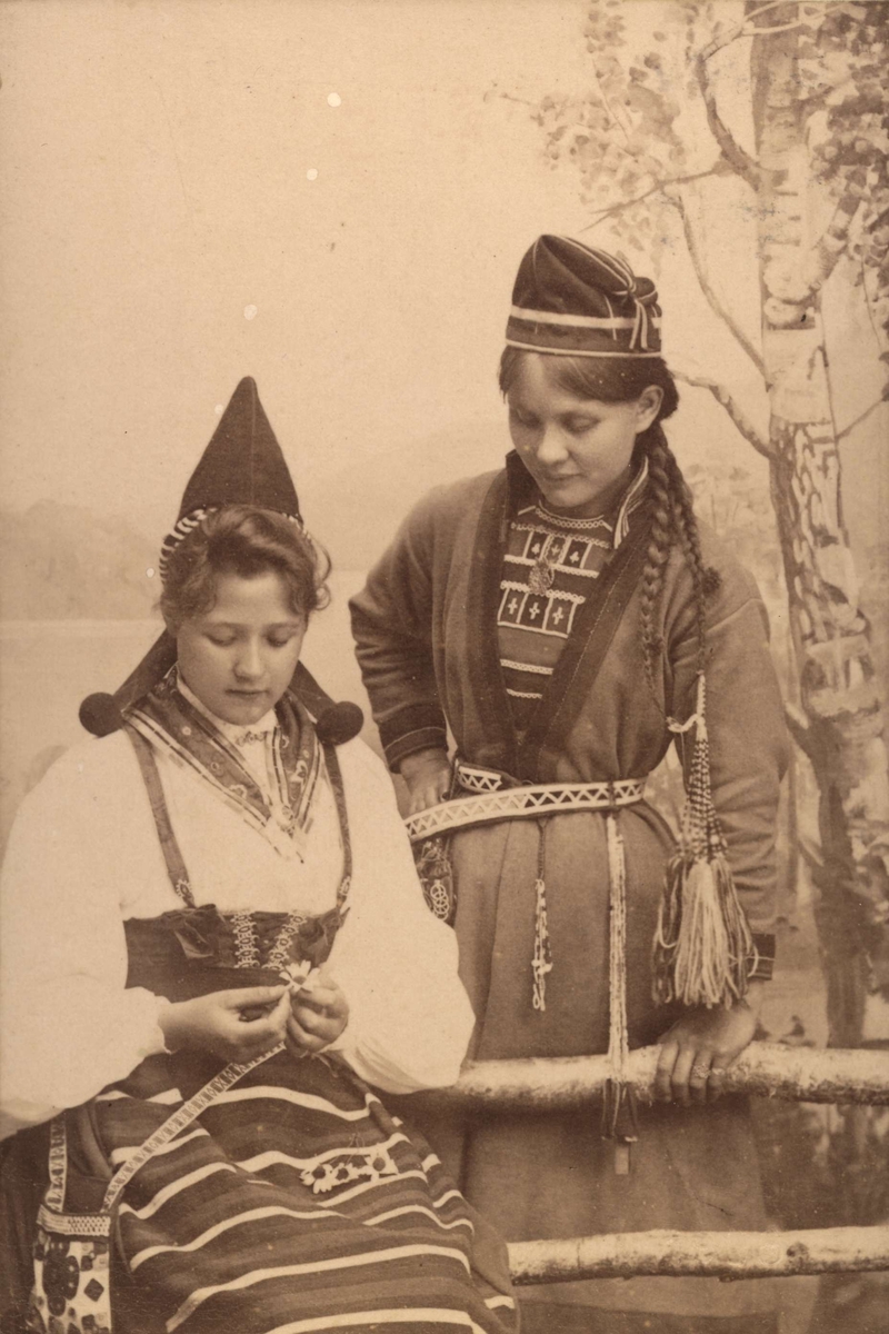 Ateljéporträtt. Två kvinnor i folkdräkt. Kvinnan till vänster bär en dräkt från Rättvik, Dalarna och kvinnan till höger bär en samisk dräkt.